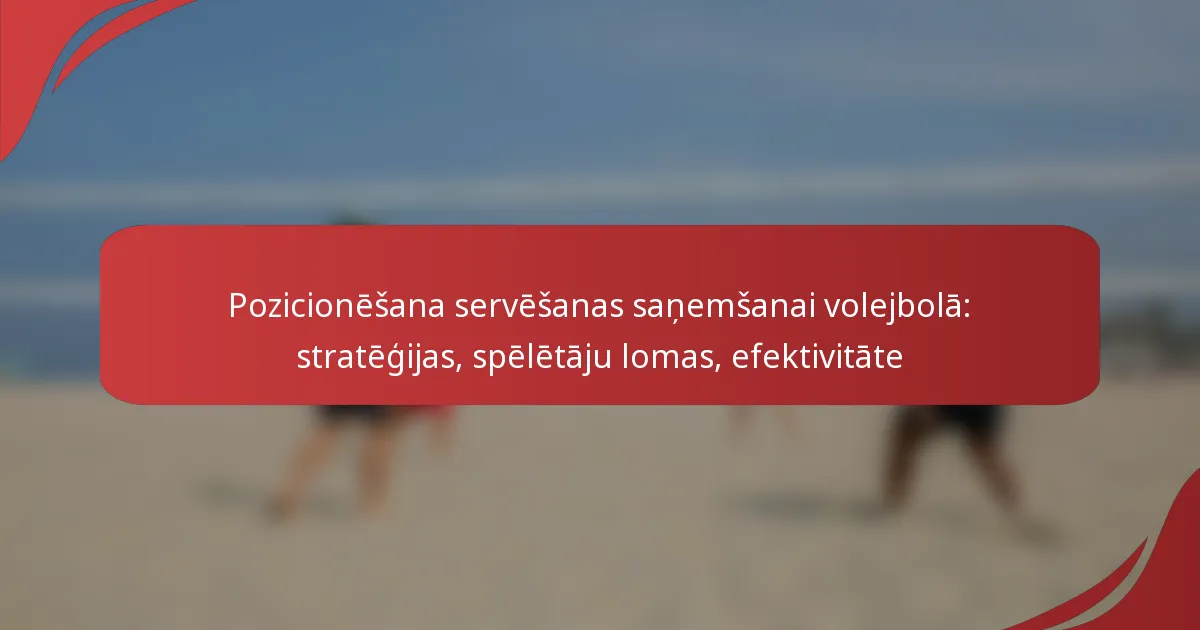 Efektīva pozicionēšana pieņemšanā volejbolā ietver dažādu stratēģiju izpratni, kas uzlabo komandas spēju reaģēt uz servēm. Galvenie elementi ietver servēšanas veidu atpazīšanu, spēlētāju stipro pušu izmantošanu, komandas formāciju īstenošanu, pretinieku analīzi un skaidras komunikācijas nodrošināšanu starp spēlētājiem.